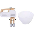 Håndmixer i træ med tilhørende hvid plasticskål fra MaMaMeMo.