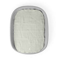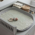 Přebalovací podložka se skládá ze šesti vrstev mušelínu v barvě Mist green a je měkká a příjemná pro malé dítě, když je čas na přebalování.