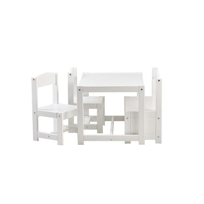Det søde og praktiske MATHILDE børnesæt fra Hoppekids består af 1 stort bord, 2 stole og 1 bænk med opbevaring. Sættet er overfladebehandlet med miljøvenligt, vandbaseret lak.