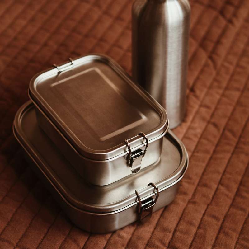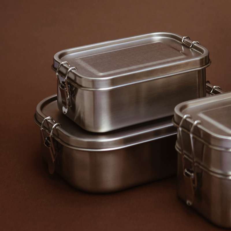 Madkassen er fremstillet af stål og lukkes med to klips, der er nemme at betjene. Indvendigt sikrer en silikonering at låget slutter tæt.