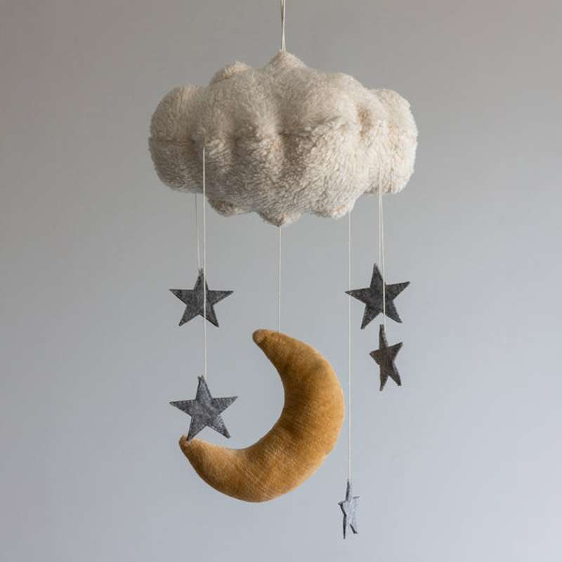 Le mobile pour bébé est constitué d'un nuage de 20 cm de long, d'où pendent de petites étoiles en velours et une lune en feutre. Il est conçu dans des couleurs douces et harmonieuses qui s'accordent avec n'importe quelle chambre de bébé.