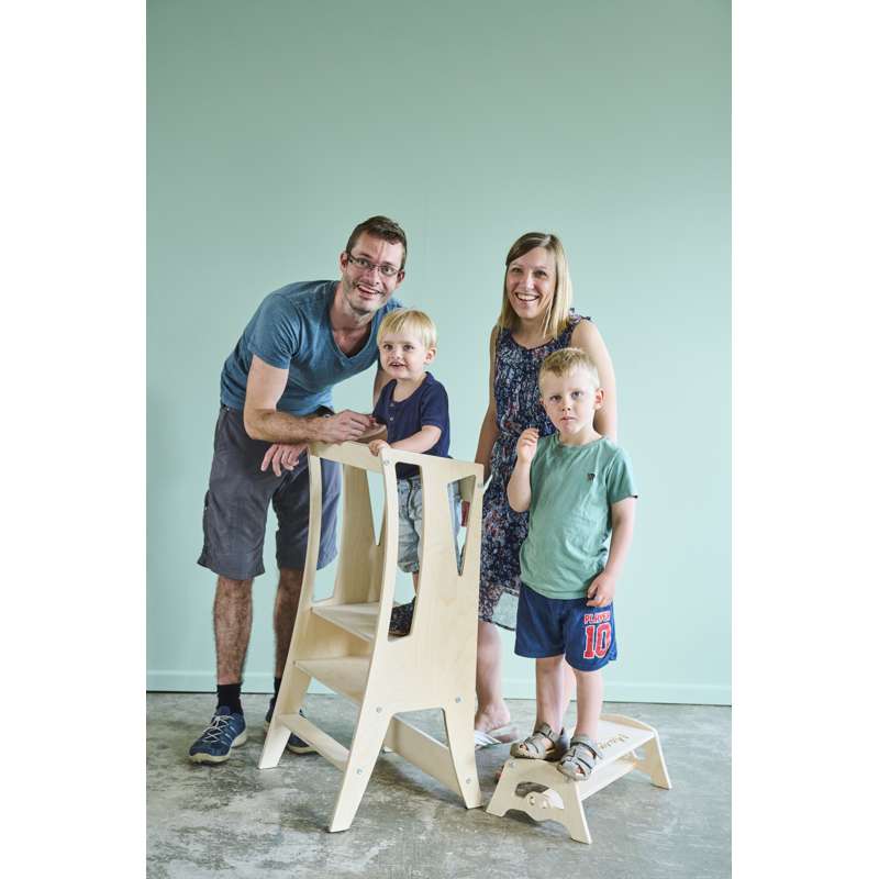 - Kan deles mellem søskende pga. 2 faste og 1 placérbart trin: det nederste trin og den brede ståplade er faste elementer. Det øverste 3. trin, er en plade, der med en enkelt hånd kan vippes op som frontplade af en voksen eller barnet selv (fra barnet er ca. 2 år). Dette giver et højdejustérbart tårn, der kan deles af søskende.