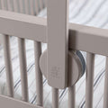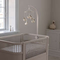 Holderen er nem at montere på Sebra Sengen samt på kravlegård eller andre tremmemøbler. De to polstrede spændeskiver beskytter overfladen og spændes sikkert sammen ved hjælp af et drejestykke. Uanset om der hænger en uro eller en sengehimmel, sidder holderen stabilt og solidt.