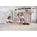 En genial seng til lidt større børn. Juniorsengen giver mere gulvplads til at lege på, og med forhæng omkring, kan den også være en hyggelig hule.