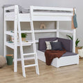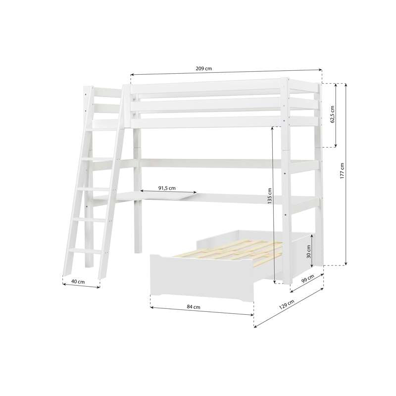 Den smarte MEGA seng i størrelse 90x200 cm med skrå stige fra Hoppekids er soveplads, arbejdsplads og lounge-område i ét. Lounge-modulet er fleksibelt og kan både bruges som siddeplads eller soveplads til overnattende gæster. Sættet indeholder højseng inkl. lameller, sengehest og stige, bordplade og lounge modul inkl. lameller. Sættet er overfladebehandlet med miljøvenlig, vandbaseret lak.