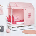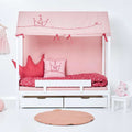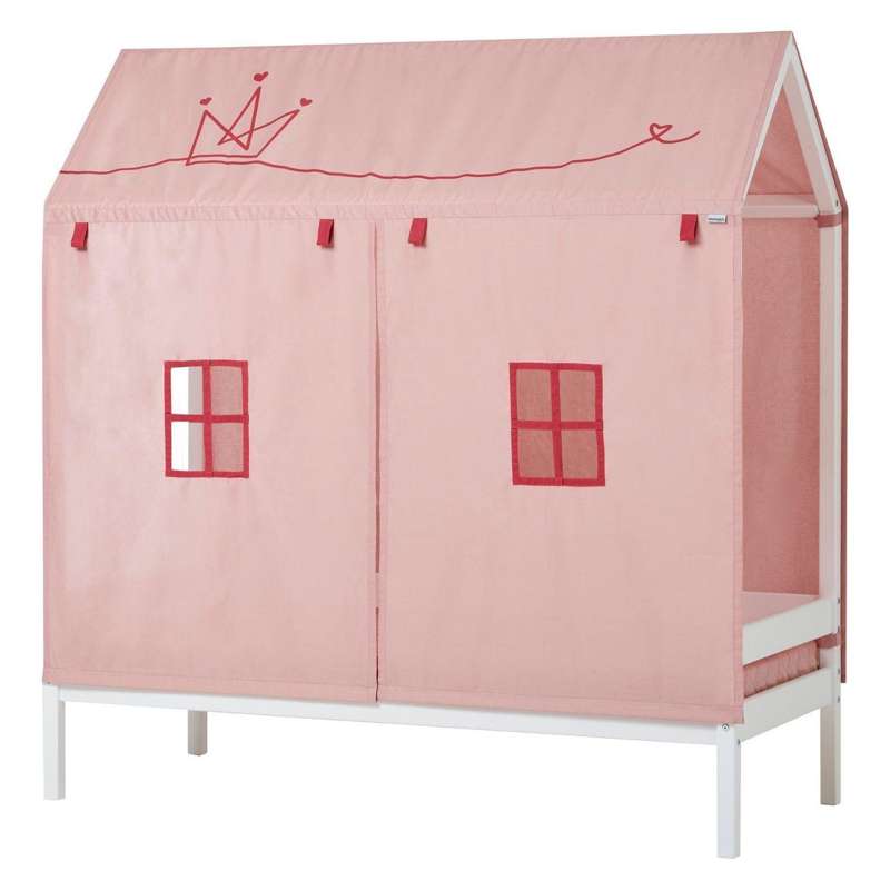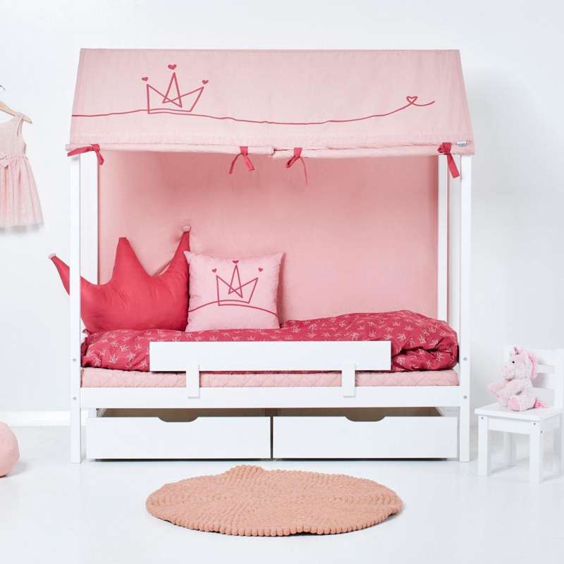 Stoftag til husseng fra PRINCESS universet fra Hoppekids. Med det smarte tekstil tag til hussengene fra Hoppekids, bliver hussengen til en hyggelig hule og rolig base på børneværelset. Stoftaget sættes let fast på sengen med velcrostropper og kan let tages af igen hvis det skal vaskes. Forsiden er delt i to, så man kan åbne helt eller delvist op foran. Taget er åbent i enderne. Med et tag til hussengen bliver sengen til et ekstra rum på børneværelset hvor der er plads til fordybning, ro og leg. Med et stoftag til hussengen er sengen ikke længere bare en seng. Måske bliver sengen i stedet til en tidsmaskine, en hytte i en fortryllet skov eller måske et smukt slot hvor prinser og prinsesser bor.