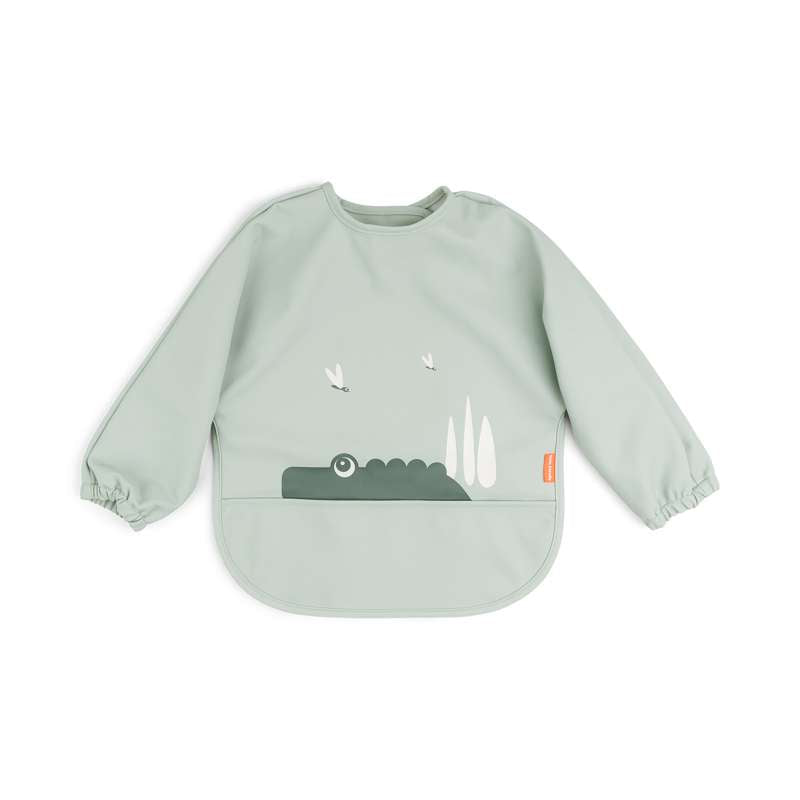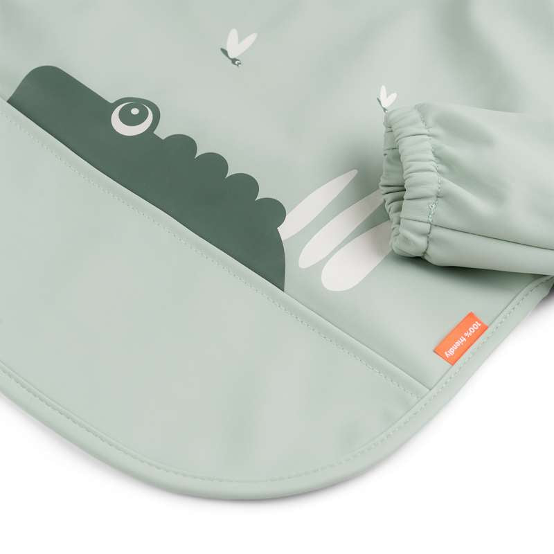 Predpasnik z dolgimi rokavi in žepom bo zaščitil oblačila vašega otroka med jedjo ali ko se igrata z barvami, modelirno maso ali drugimi kreativnimi stvarmi. Prilagodljiv dvojni zapon je zagotovilo, da predpasnik ustreza tako dojenčkom kot malčkom. Mehak predpasnik je vodoodporen in ima praktične rokave z elastiko, ki ohranjajo majhne suhe. Enostavno ga je obrisati in ohraniti čist, kar vam prihrani veliko perila. Lep zeleni predpasnik je okrašen s Croco in kresnicami.